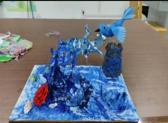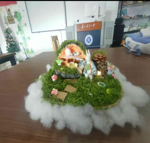 大赛以“绿动·家居”“绿动·时尚”“绿动·未来”为主题,鼓励同学们将生活中常见的废旧物品进行创意改造,转化为兼具实用价值与美学意义的作品。同学们在比赛中各展所长:有的将废弃材料改造为寝室装饰或实用家居用品,有的则设计出充满科技感的环保概念模型。例如,来自学前F2211班的江倩竹同学以塑料粘土创作出生动的海洋生态场景;同班的李姝乐同学则运用棉花、纸箱等材料,塑造出灵动可爱的“空中花园”。每一件作品均在现场进行实物展示,配合选手对创作思路的讲解,充分展现了同学们的巧思妙想与绿色理念。