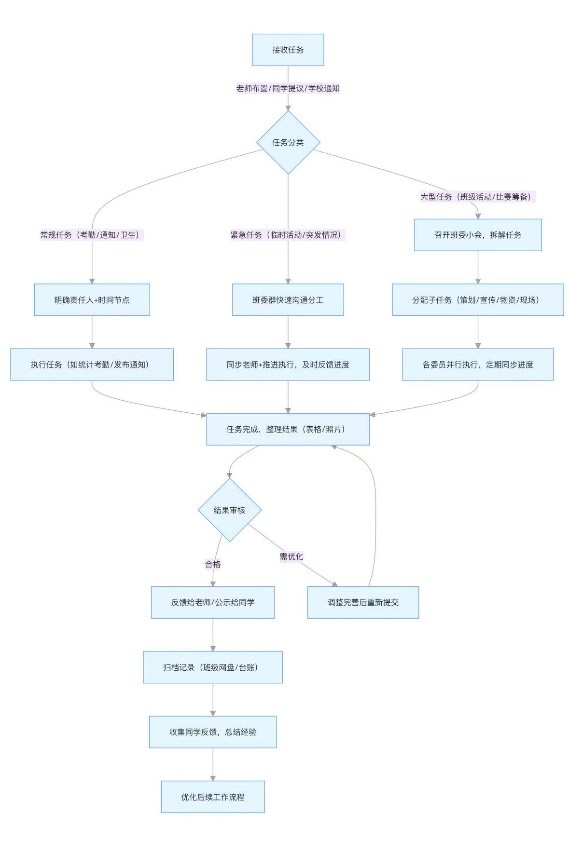 在“先进班集体”创建中期,学前2311班班委依托分类推进、闭环管理的工作流程,实现了班级事务的高效落地:从接收任务起,班委先根据“常规/紧急/大型”三类场景精准分工——常规事务(如考勤、卫生)明确责任人与节点,紧急任务(如临时学训安排)通过班委群快速联动,大型活动(如专业技能赛筹备)则拆分策划、宣传等模块并行推进;执行中同步进度、整理成果,再经“结果审核”优化调整,最终反馈公示、归档复盘并收集同学建议。