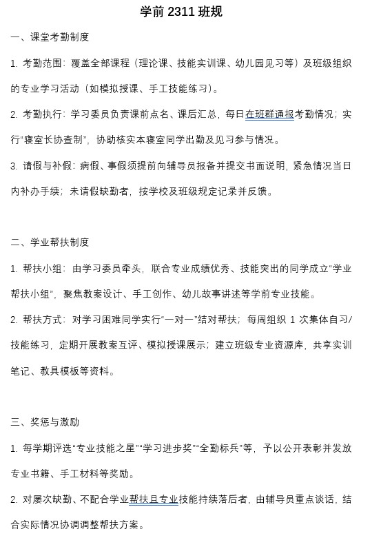 制度是学前2311班专业发展的“指南针”。为适配学前教育专业的学训节奏,打造严谨务实的学习氛围,推动班级管理与专业成长同频高效,我班立足学前技能培养需求,与班级同学共同制定了班规。
