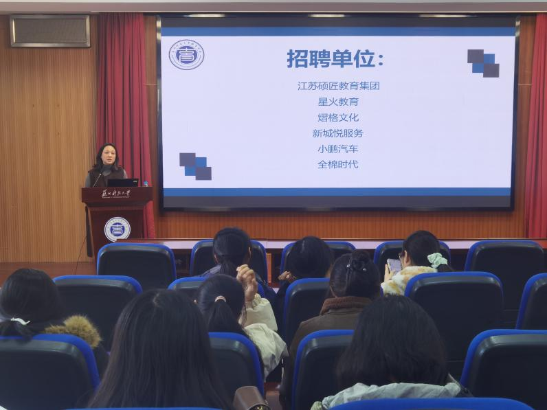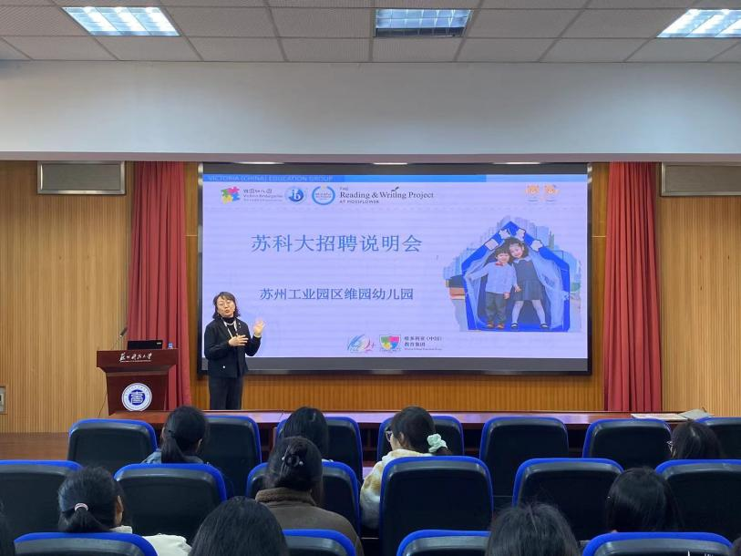 在随后的企业宣讲环节,各代表详细解读了行业发展、岗位需求与职业前景。其中,苏州市维园幼儿园园长王洛丹重点介绍了幼儿园的发展历程、办园理念、招聘要求及福利待遇。她特别提到,自办园以来,已先后录用苏州科技大学教育学院学前教育专业的5名毕业生,并对他们的专业能力和工作表现给予了高度肯定。“她们踏实敬业、专业扎实,是我们园所重要的发展力量。”王园长表示,期待更多教育学院学子加入。