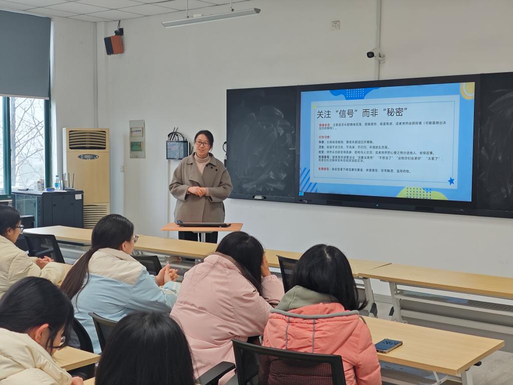 会上,张洁围绕宿舍信息员与心理委员的角色定位、工作职责及心理健康识别机制进行了系统讲解。她强调,信息员是“观察者”而非“治疗者”,核心任务是在日常交流中关注同学情绪与行为变化,及时发现异常信号。针对春季气温波动易引发情绪波动和心理问题复发的情况,她还详细介绍了情绪、行为、言语等几类需重点关注的心理异常识别信号,提醒信息员在日常工作中保持敏锐,既要关心同学,也要注意方式方法,避免窥探隐私,做到关心有度、上报及时,真正成为“一双敏锐的眼睛、一只倾听的耳朵、一根及时传递信息的线”。辅导员薛颖强调了各班需落实每周心理健康状况上报制度,遇特殊情况第一时间向学院反馈,做到早预防、早干预。