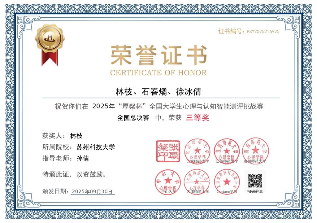2025年9月27日,首届“厚粲杯”全国大学生心理与认知智能测评挑战赛在北京师范大学圆满收官。教育学院应用心理学专业林枝、石春燏、徐冰倩三位同学的作品《大学生AIGC依赖量表的编制及信效度检验》摘得全国总决赛三等奖。