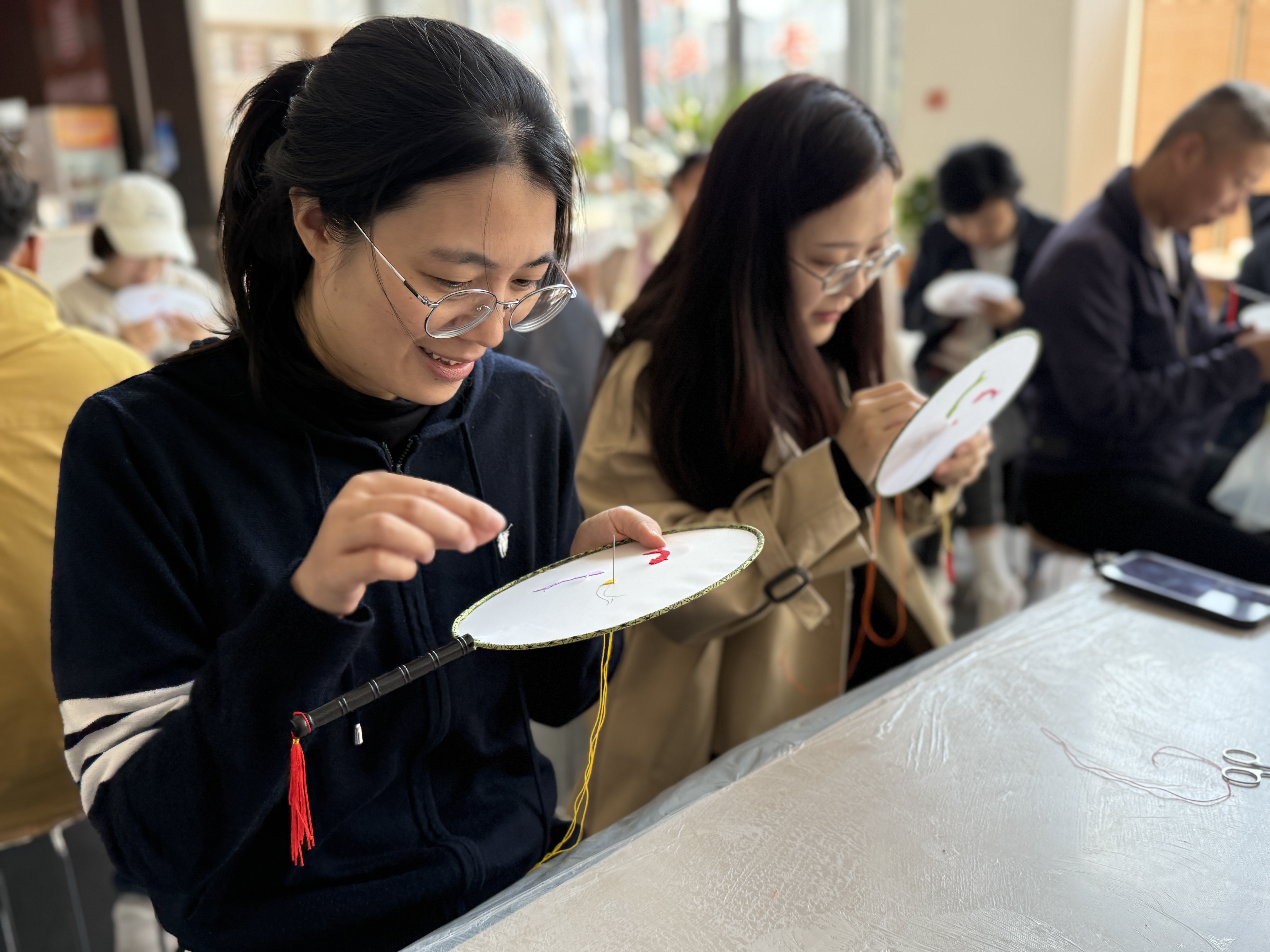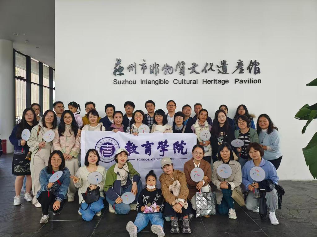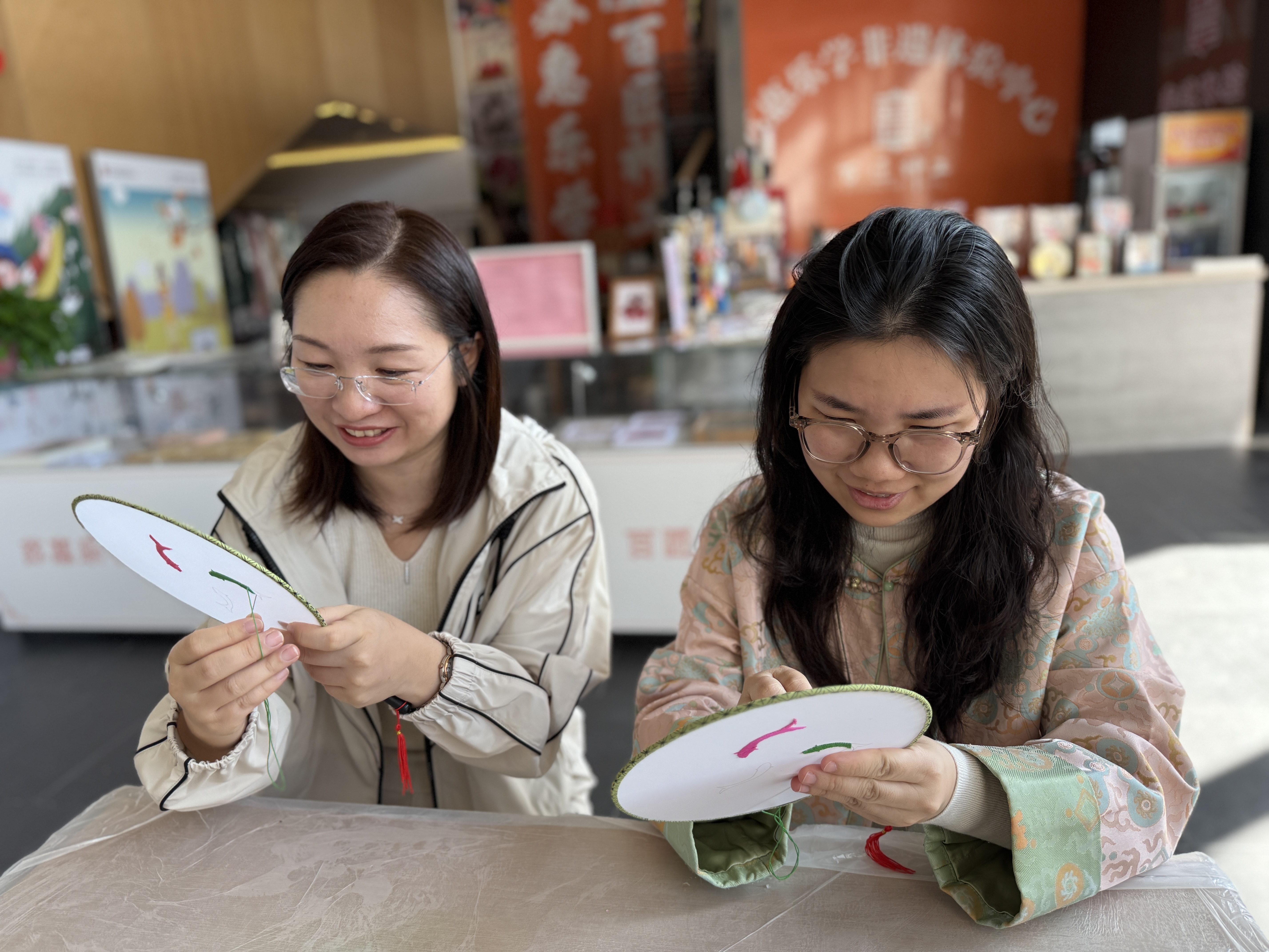 上午,教职工们集体前往苏州非物质文化遗产馆,参观各类非遗展陈,并亲身体验了传统手工艺——苏绣。在专业老师的悉心指导下,大家飞针走线,细心勾勒,领略苏绣艺术的精致与典雅,感受指尖流转的文化魅力。
