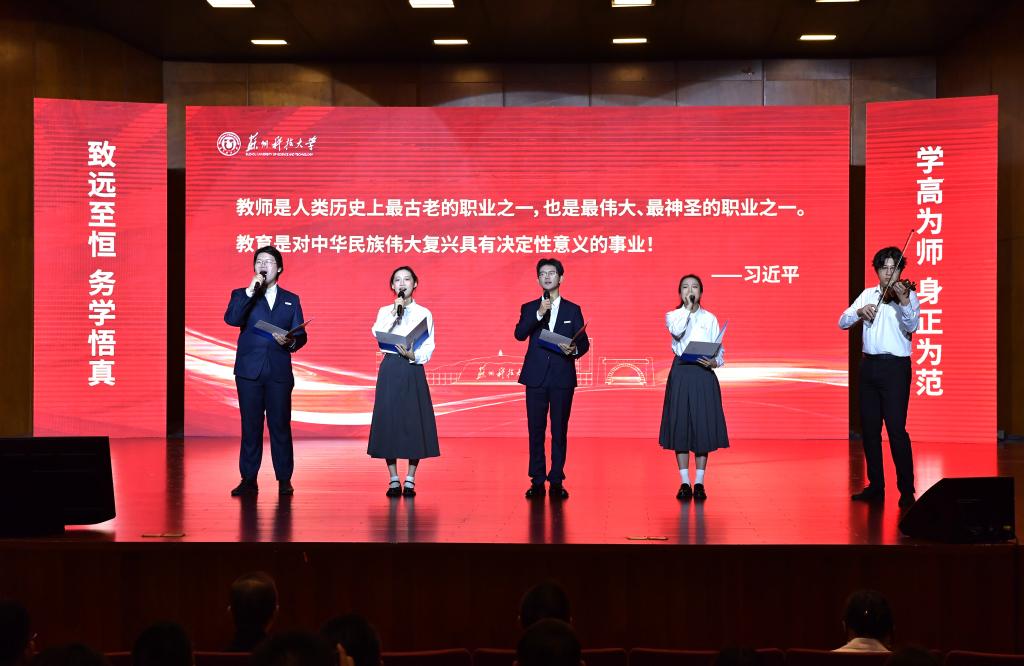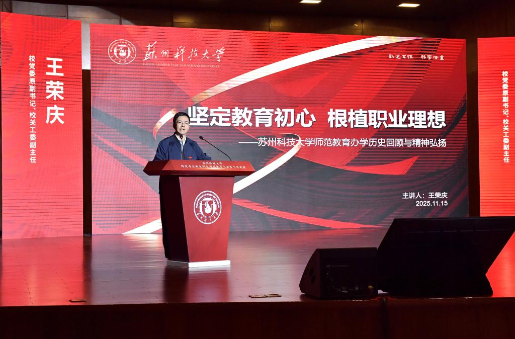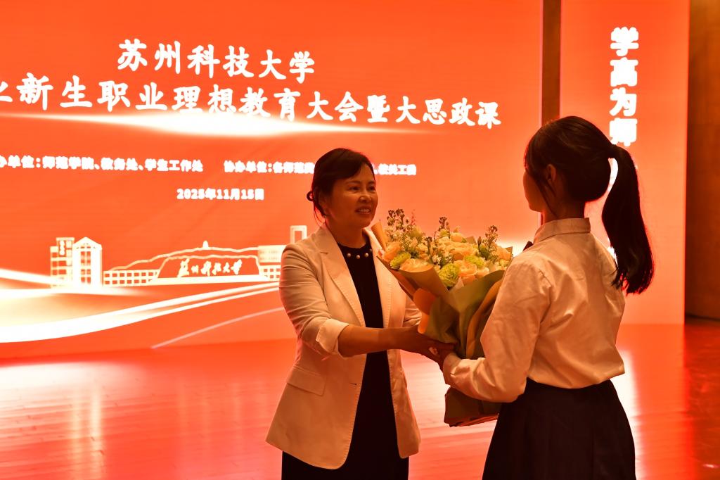 2025年11月15日上午,苏州科技大学在音乐厅隆重举办了师范专业新生职业理想教育大会暨大思政课活动。活动由师范学院、教务处、学生工作处联合主办,各师范类专业学院及校关工委协办。苏州市委教育工委副书记、市教育局机关党委书记徐卫,校党委常委、副校长崔雪丽、唐柏鉴,来自苏州市多所中小学的校友代表、业界名师及校内相关单位负责同志共同出席,与师范新生齐聚一堂,共话教育理想。活动由教育学院/师范学院党委副书记徐瑾主持。