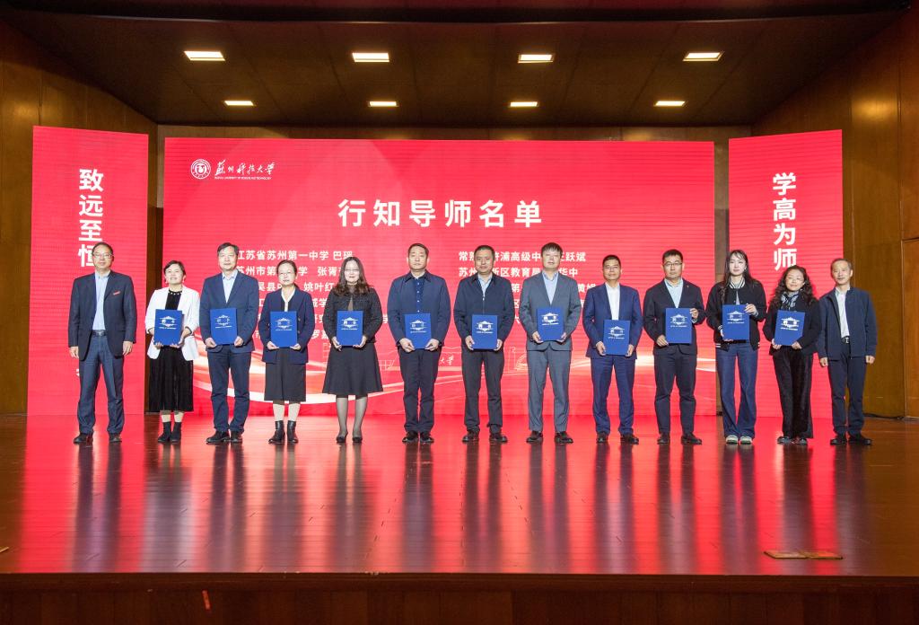 随后举行了行知导师受聘仪式。苏州市委教育工委副书记、市教育局机关党委书记徐卫,苏州科技大学党委常委、副校长唐柏鉴共同为导师代表颁发聘书。