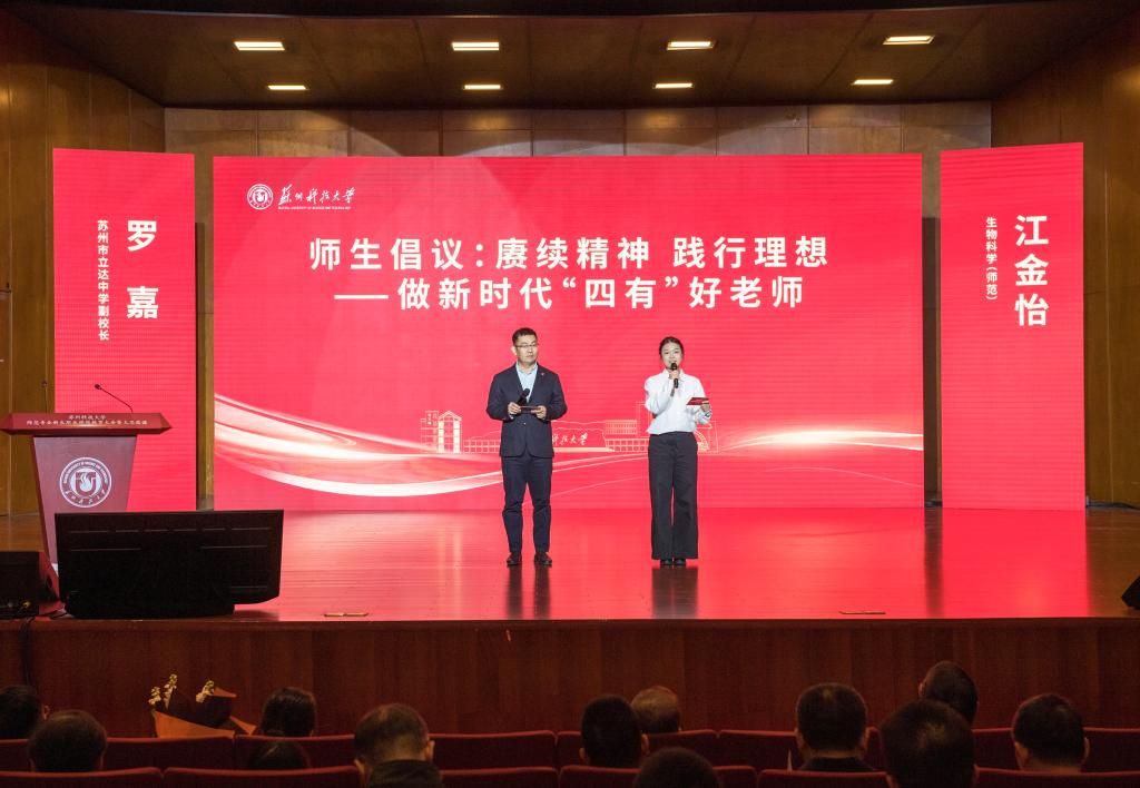 在“同频·共进”环节,受聘导师苏州市立达中学副校长罗嘉与我校生物科学(师范)学生代表江金怡共同发起《赓续精神践行理想——做新时代“四有”好老师》倡议,号召全体师范生以实际行动传承师范文脉、践行育人使命。