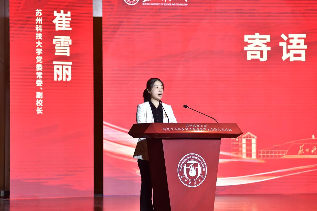 最后,校党委常委、副校长崔雪丽在讲话中对全体师范新生提出三点期望:一要铸牢思想之魂,坚守“为党育人、为国育才”的初心使命;二要厚植师范底蕴,锤炼“传道授业、立德树人”的过硬本领;三要勇担时代之责,争做“守正创新、笃行致远”的教育新人。她勉励同学们坚定理想信念,珍惜大学时光,传承师范薪火,早日成长为党和人民满意的新时代好老师。