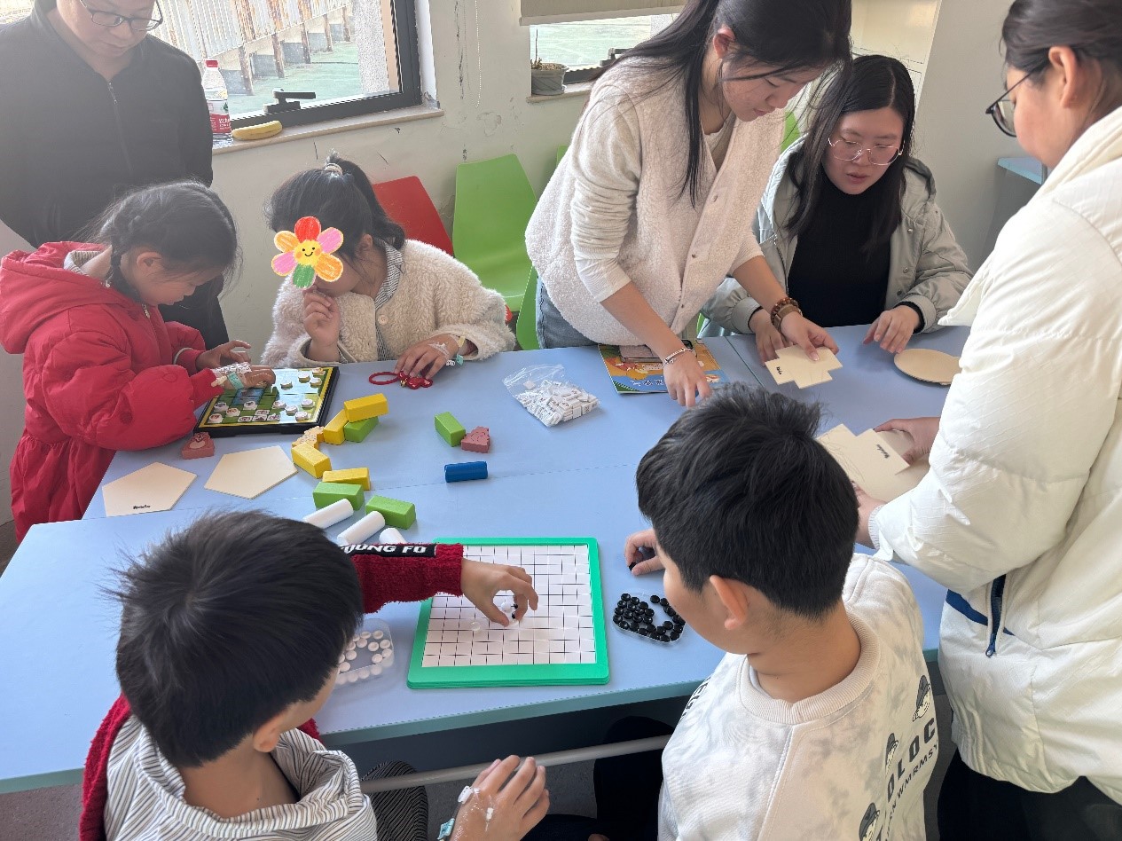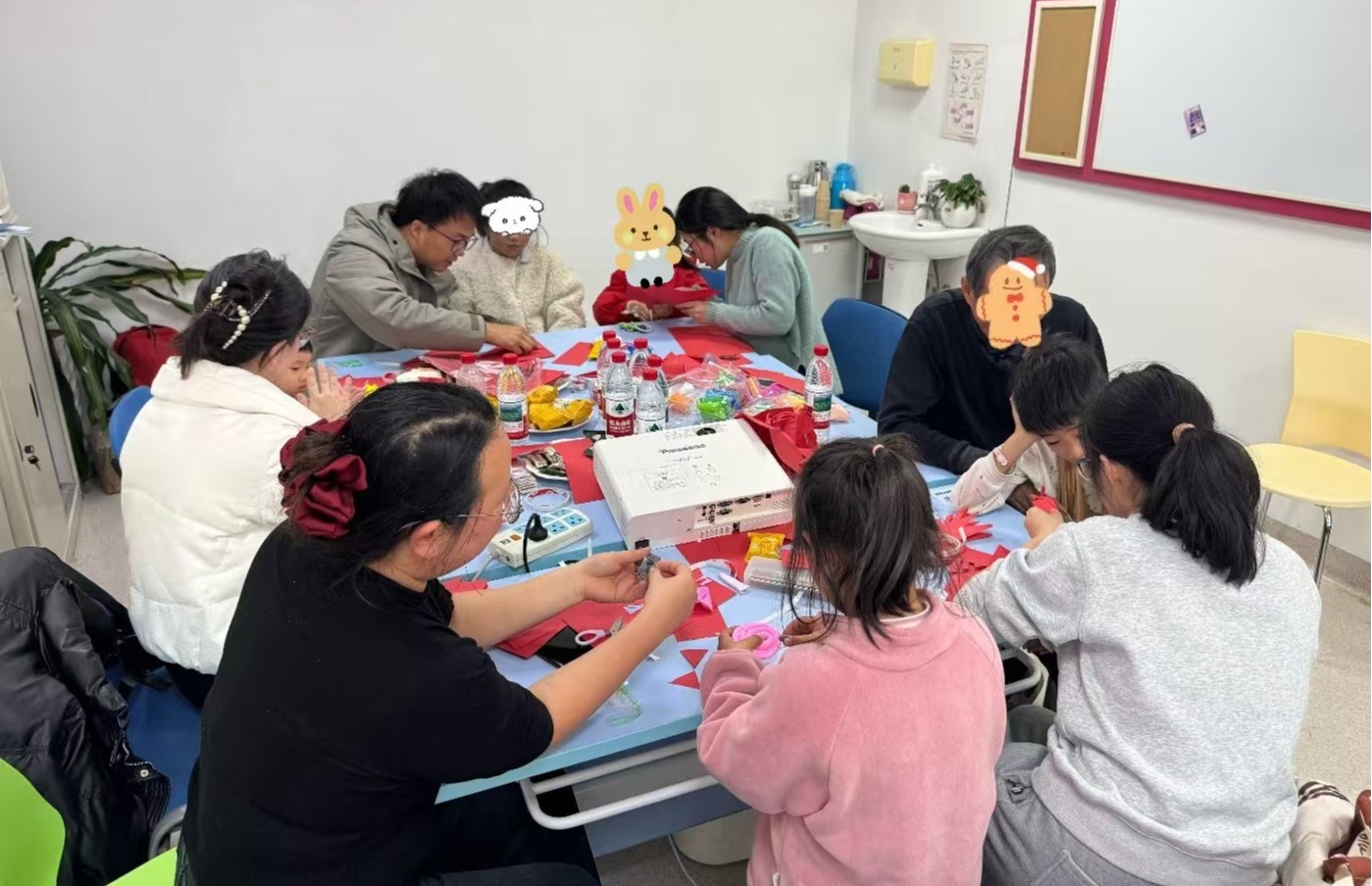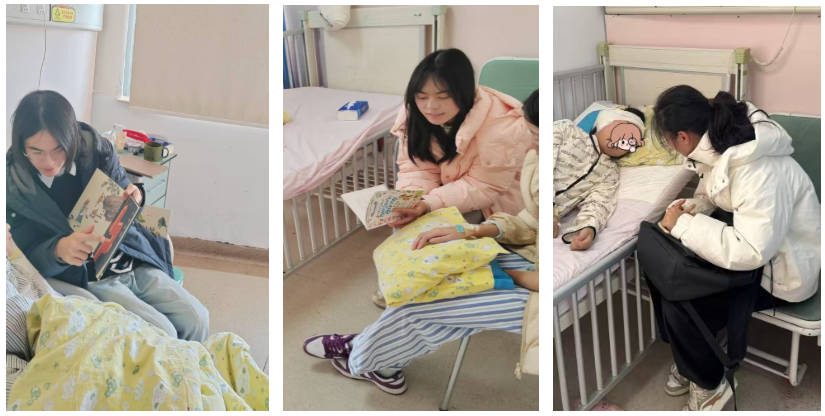 随后,志愿服务活动按年龄与身体状况分组有序开展。10 岁以下低年级组中,严家丽、薛颖老师带领学前教育专业学生,通过趣味桌游、绘本阅读、粘土制作、亲子下棋等互动形式,激发孩子们的想象力与参与感;10 岁以上高年级组里,吴晓刚、张帆老师与心理学专业学生一道,以剪纸创作、主题聊天等方式,倾听孩子们的心声,缓解他们的住院焦虑;针对行动不便的患儿,贾凤芹老师则带领学生专程进入病房,用温柔的语调讲述绘本故事,轻声交流陪伴,让孩子们在温馨氛围中感受关怀。