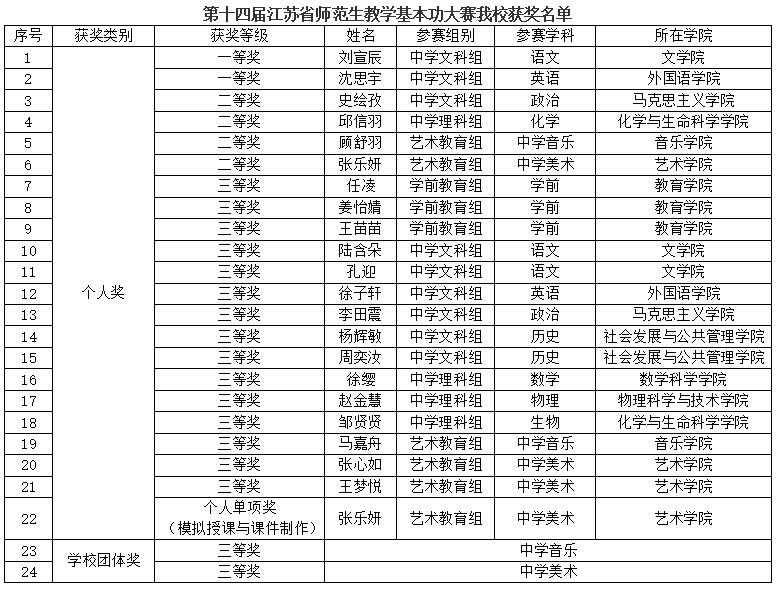 我校师生参加了由江苏省教育厅主办、江苏省教师教育专业指导委员会承办的第十四届江苏省师范生教学基本功大赛。我校学子凭借扎实的专业功底与出色的教学素养,在激烈角逐中脱颖而出,共斩获24个奖项,其中一等奖2项、二等奖4项、三等奖15项、个人单项奖1项,学校荣获中学音乐和中学美术学科学校团体奖三等奖2项。